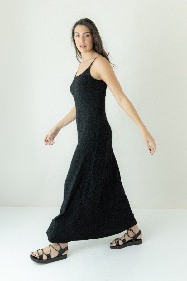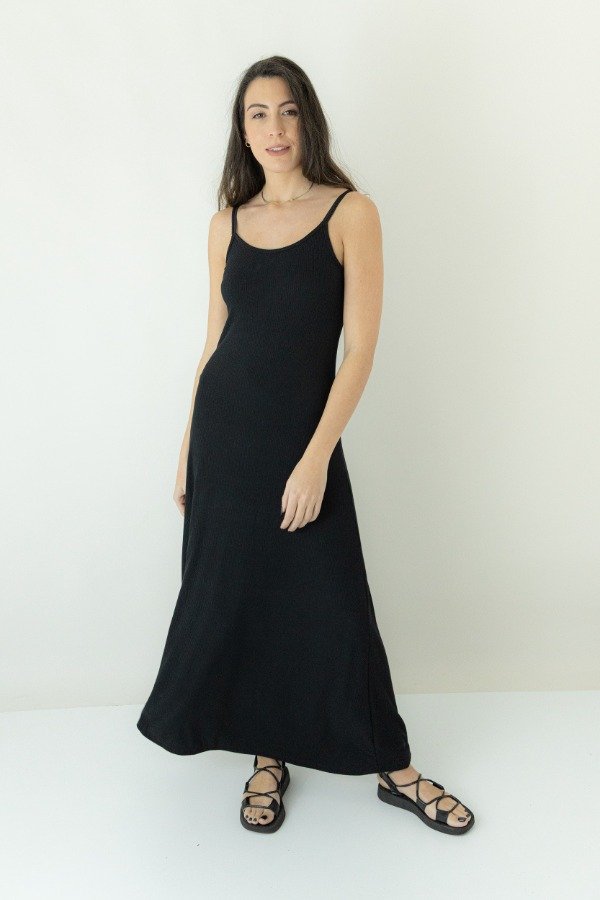 VESTIDO EN MORLEY CON RECORTE EN CINTURA Y FALDA CON VUELO. BRETELES EN ELASTICO PLISADO.