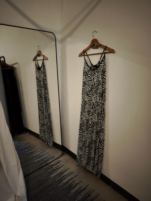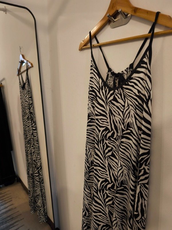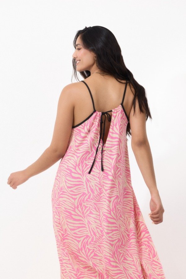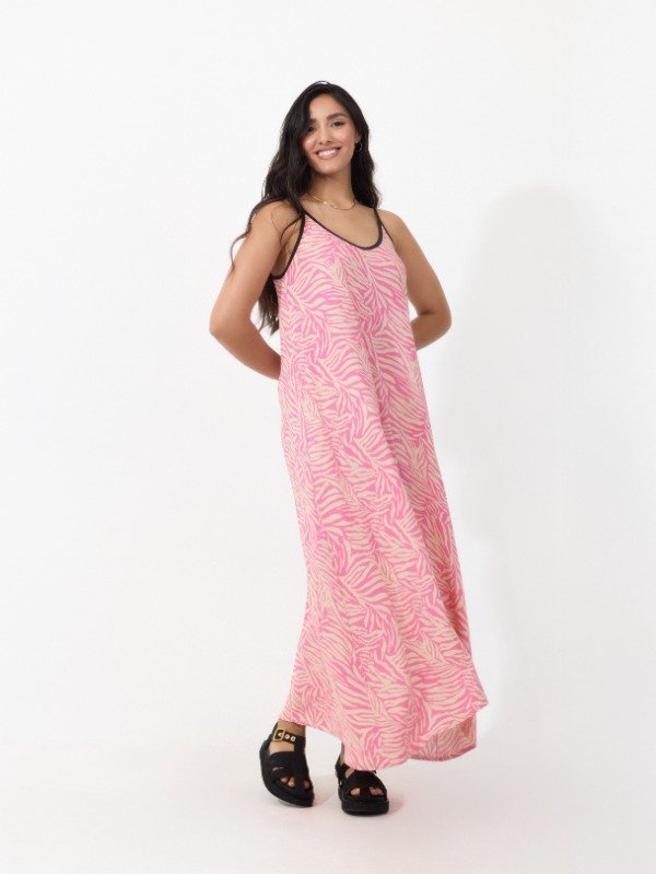 VESTIDO EN LINO ELASTIZADO ESTAMPADO. ENVIVADO CON NEGROS AMBAS VTES. BRETELES REGULABLES SE ATAN EN ESPALDA. CUERITO MARCA .