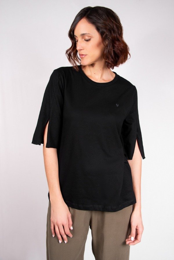 REMERA EN JERSEY 24/1 100%ALG. CON MANGAS CON TAJOS EN EL DELANTERO. BORDADO CORAZON AL TONO DE LA TELA