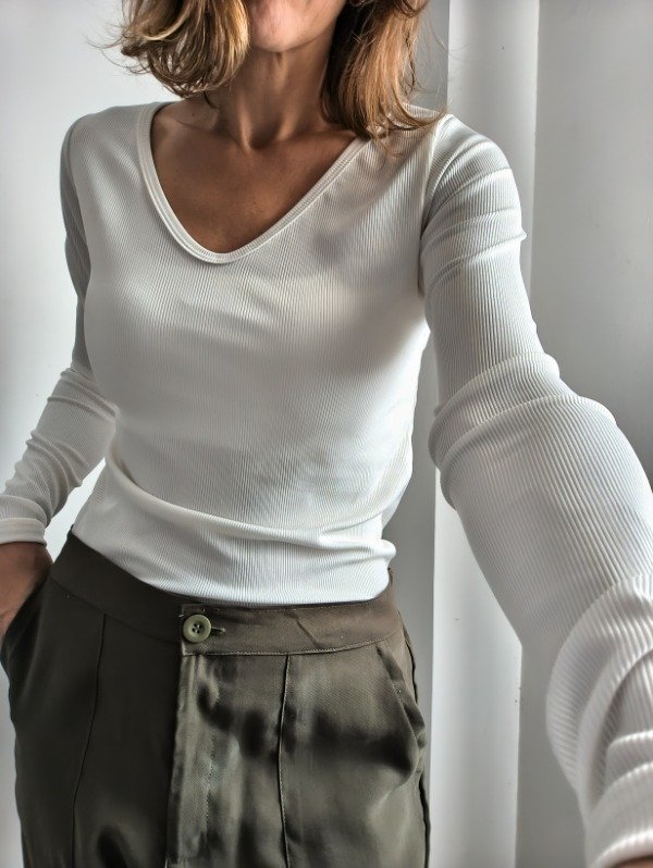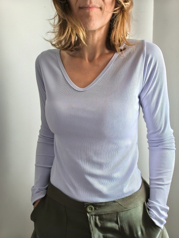 REMERA BASICA ESCOTE V EN MICROMORLEY CON MANGAS BIEN LARGUITAS PARA QUE NO ENTRE EL FRIO. EL MICROMORLEY TIENE UN ASPECTO MAS ARREGLADO QUE UN MORLEY DE ALGODON. CALCE MAS AL CUERPO.