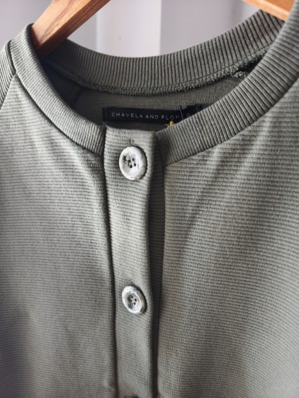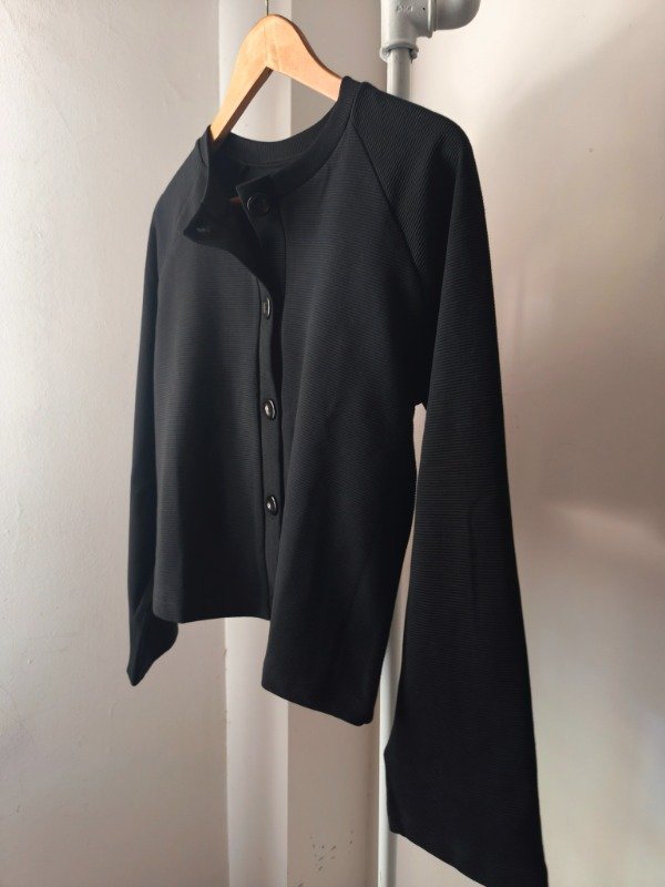 Saco en material 100%algodon con trama canelon finito. Corte manga ranglan con carteras y botones al tono.