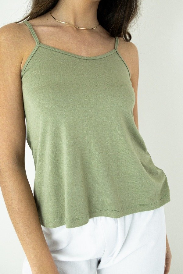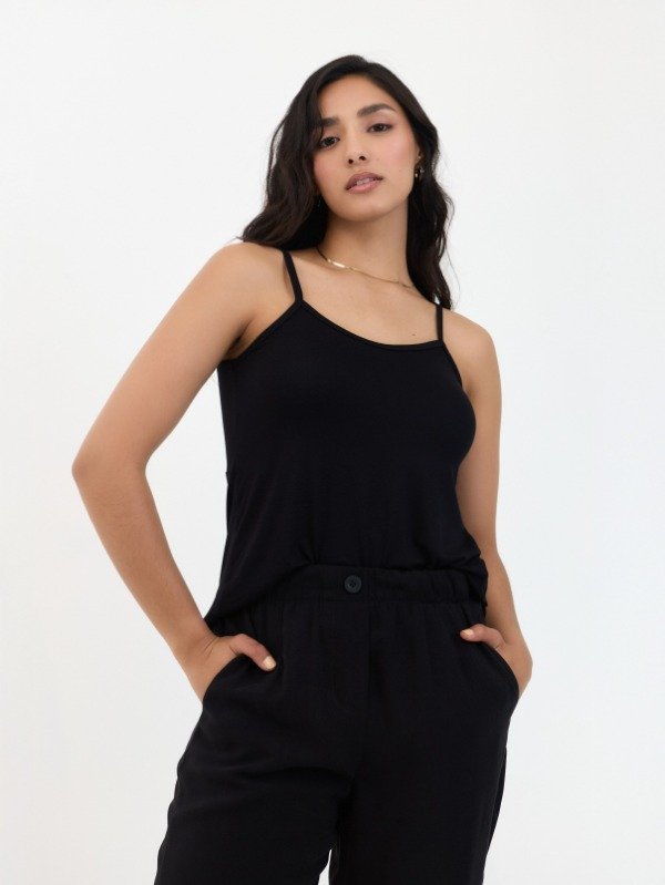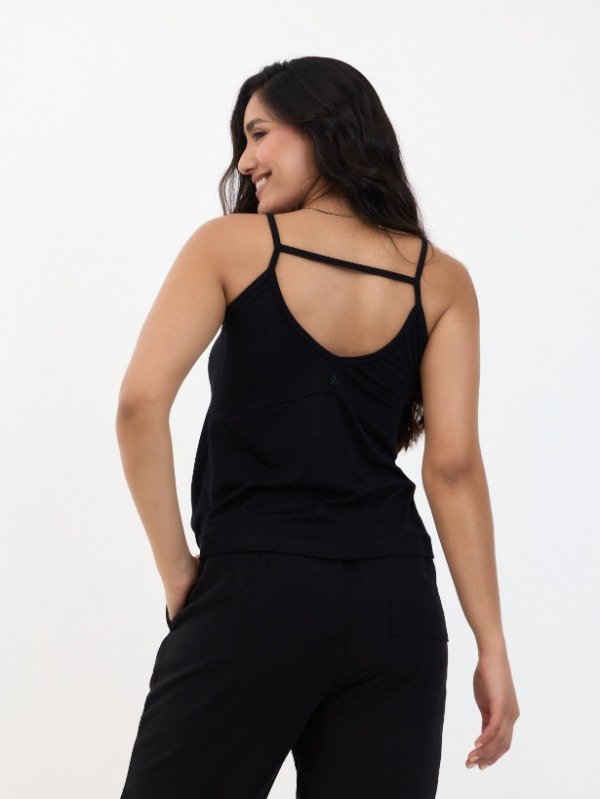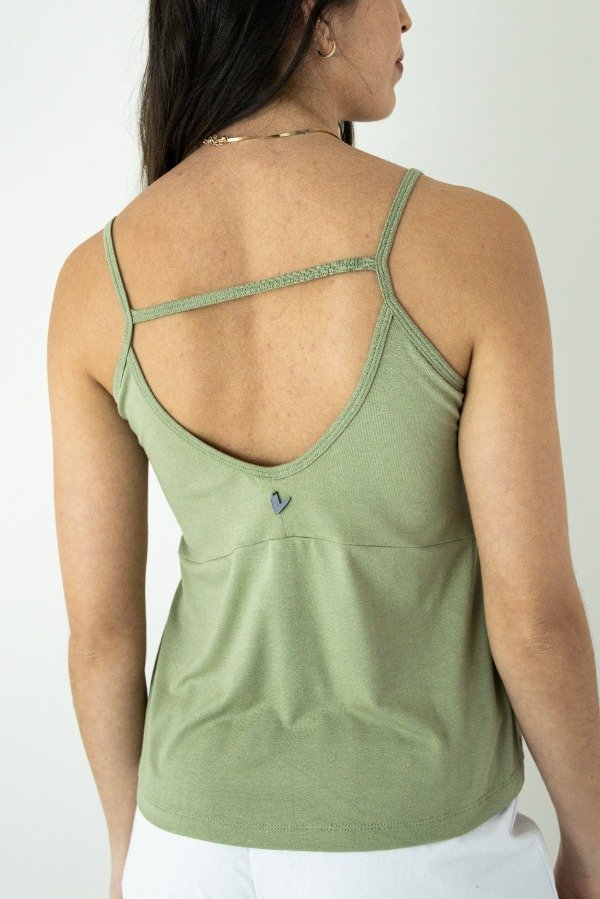 MUSCULOSA EN MODAL CREPE CON RECORTE EN ESPALDA QUE LE DA UN EVASE A LA PARTE INFERIOR. DIJE CORAZON COSIDO EN ESPALDA.