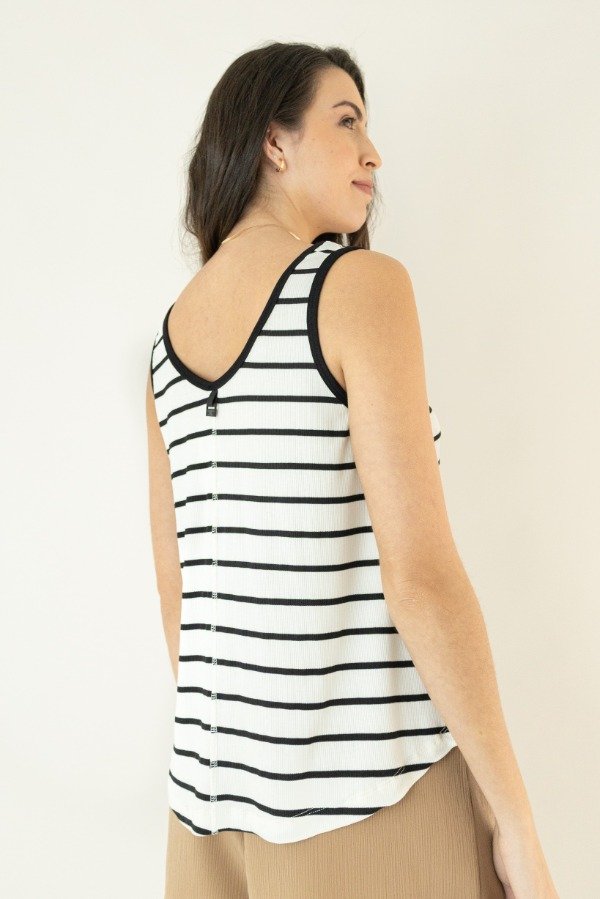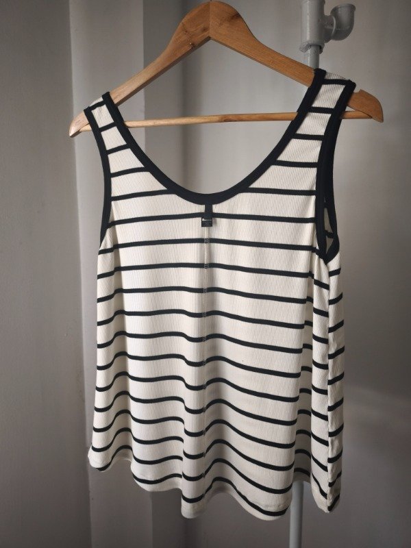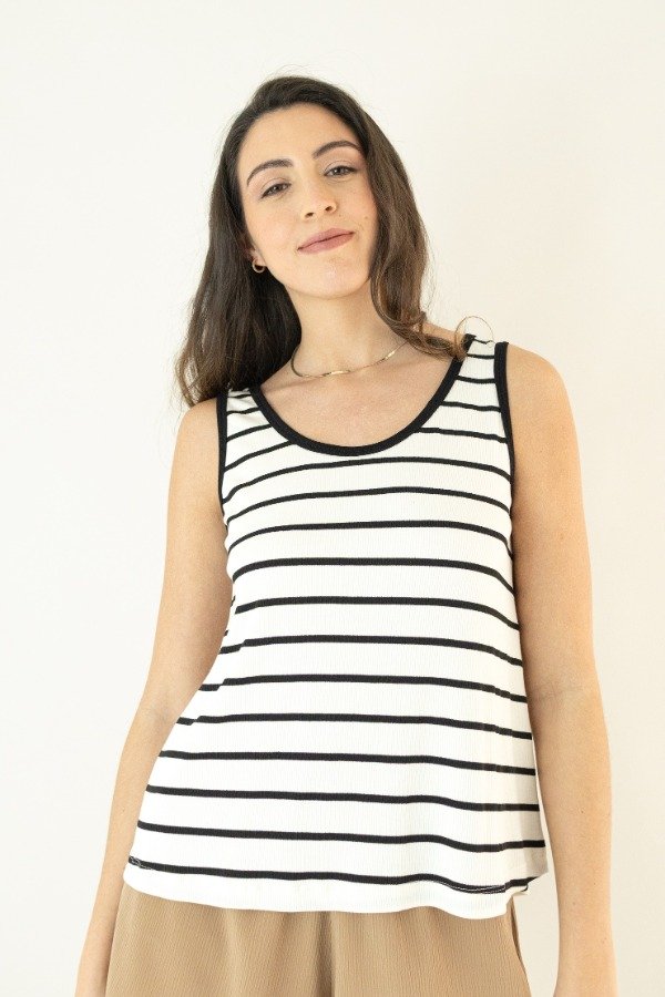 MUSCULOSA EN MORLEY VISCOSA RAYADO. CORTE EVASE . TIENE UN RECORTE EN ESPALDA Y DIJE ACRILICO