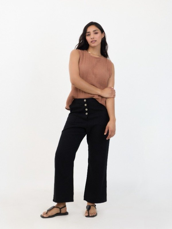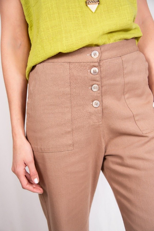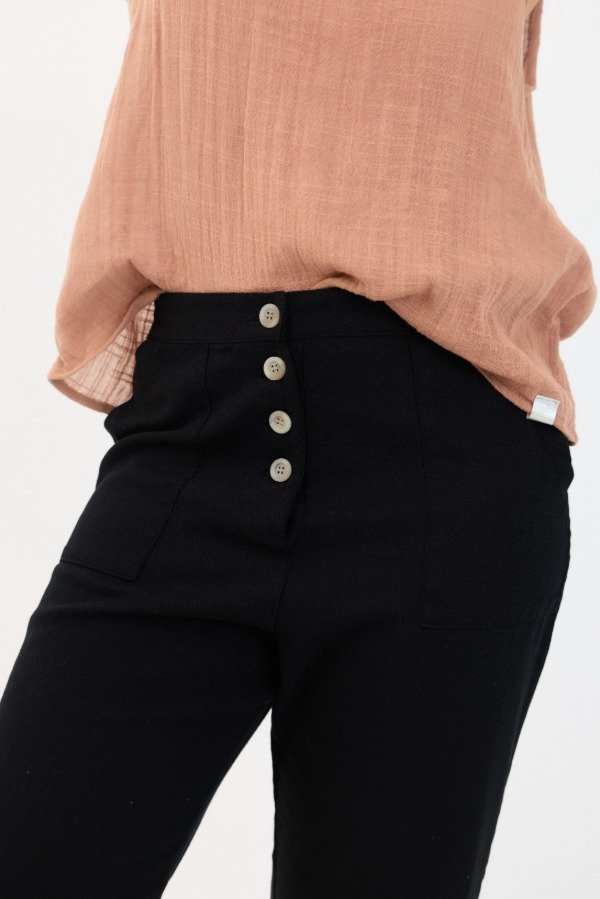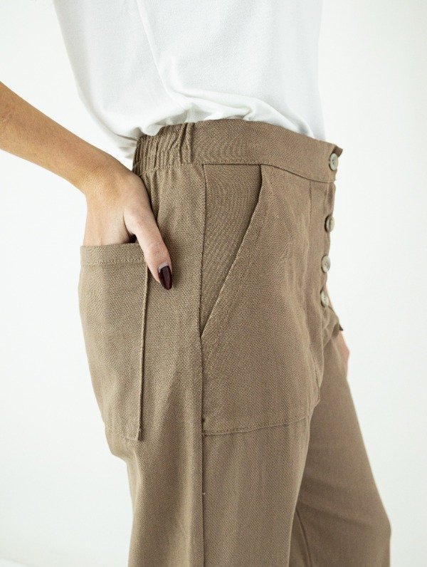 Pantalón rígido en gabardina liviana con trama bien marcada. corte semi wide leg con cartera con botones a la vista. Bolsillos delanteros y uno plaque trasero. La cintura tiene elástico solo en la parte trasera lo que le da mucho confort a la prenda y se adapta a diferentes cinturas.
