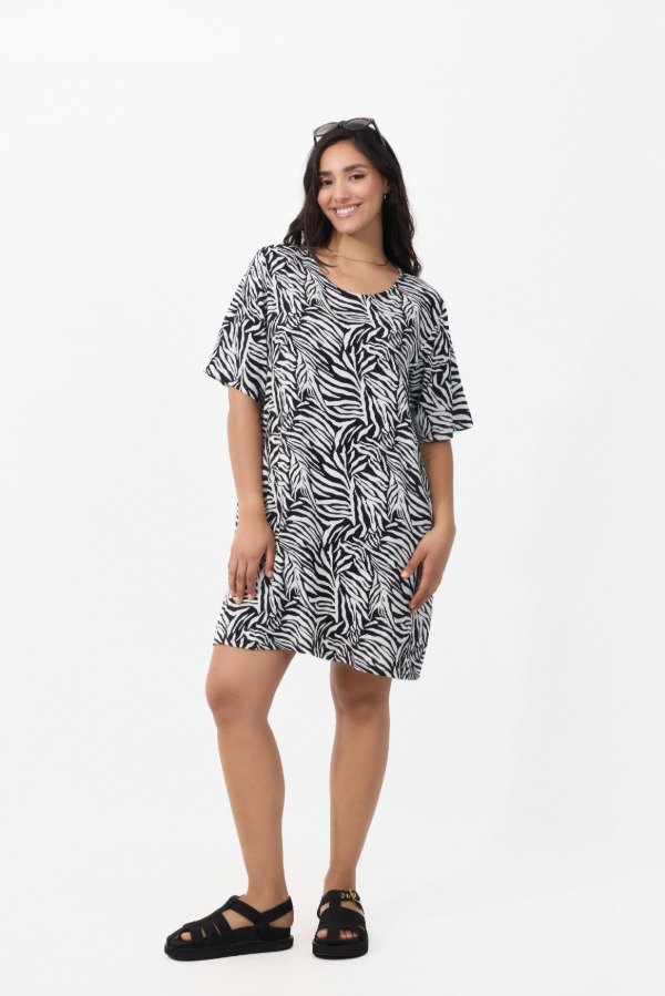 VESTIDO CORTO EN LINO ELASTIZADO ESTAMPADO. PRE-LAVADO.