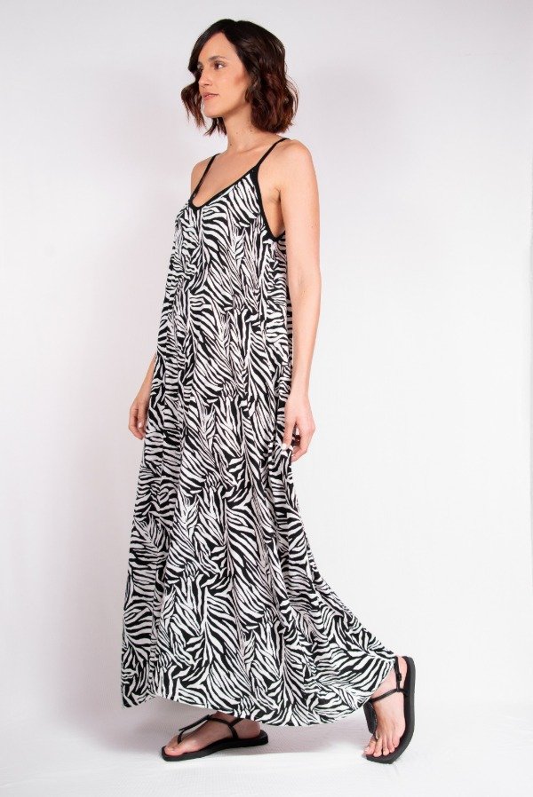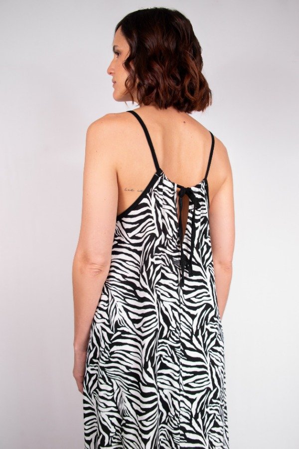 VESTIDO EN LINO ELASTIZADO ESTAMPADO. ENVIVADO CON NEGROS AMBAS VTES. BRETELES REGULABLES SE ATAN EN ESPALDA. CUERITO MARCA .